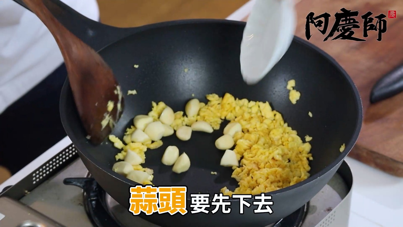 熱鍋下油,將蛋液打散倒入鍋內炒成蛋酥,再加入蒜頭拌炒至蛋酥變金黃色。