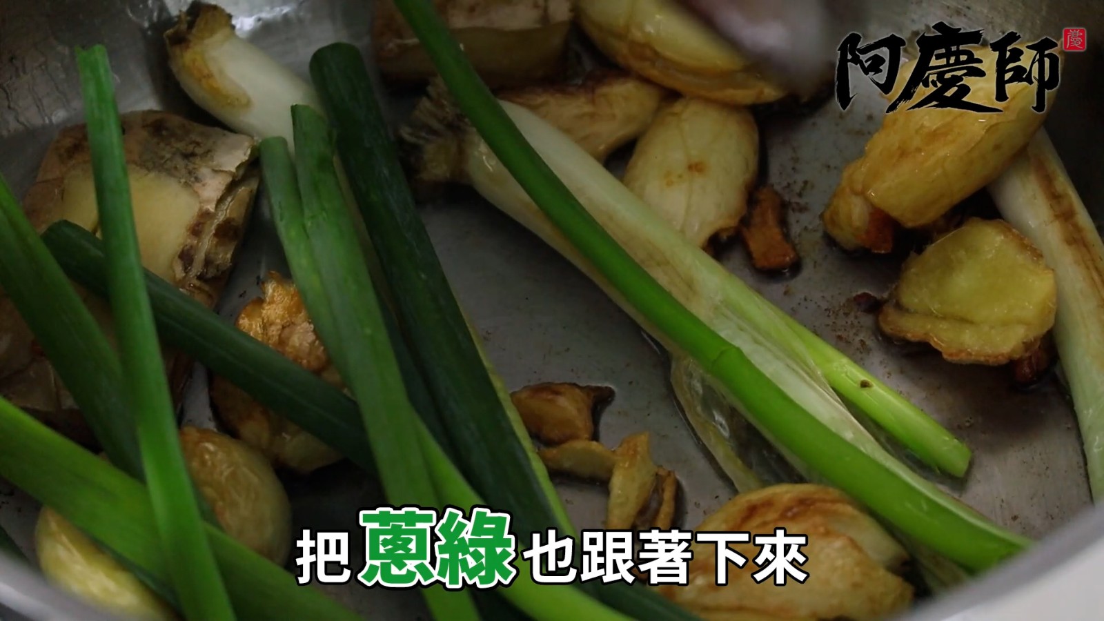 鍋中加入油,依序將「蒜頭、老薑、蔥段」下鍋以中小火爆香炒至表面金黃色。
