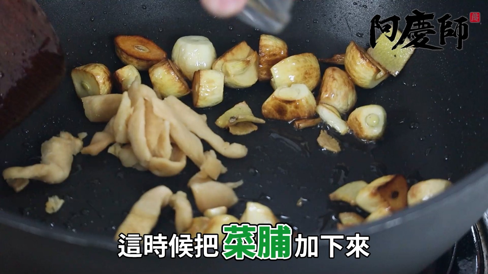 切蒜頭、薑片,熱鍋加油下去爆香,加菜脯以中小火炒30秒後,下「蠔油、米酒、花雕酒、白胡椒粉、黑胡椒粉、天然鮮味粉、水」調醬汁。