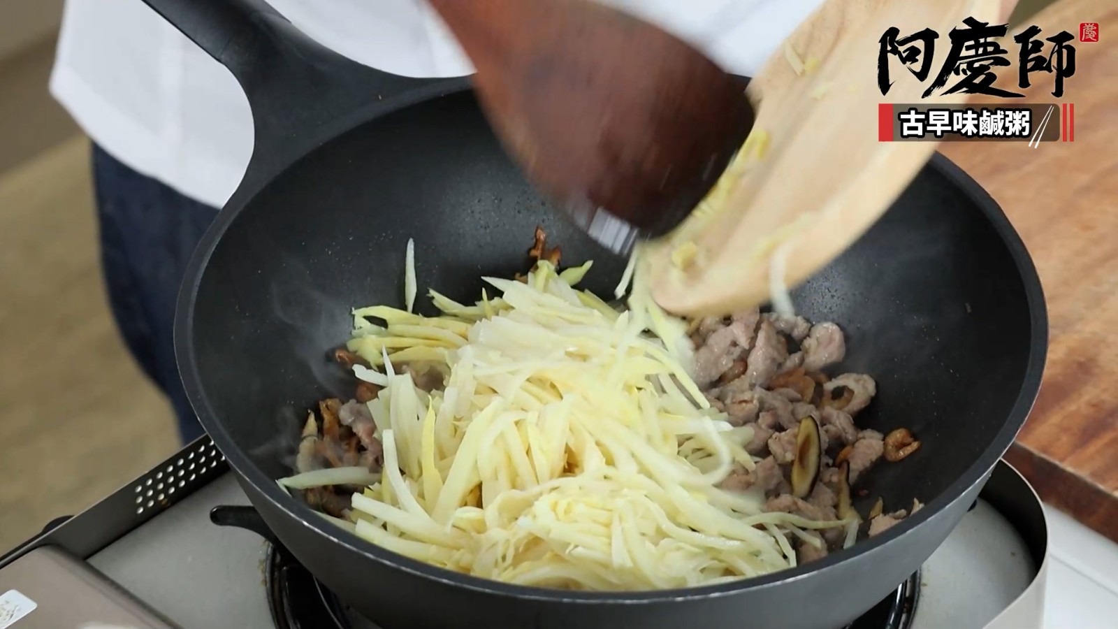 先將「筍絲、乾香菇」切成絲狀備用,熱鍋下油,依序把「乾香菇、金鉤蝦」加入鍋中煸炒,最後加入「肉絲、筍絲」拌炒。